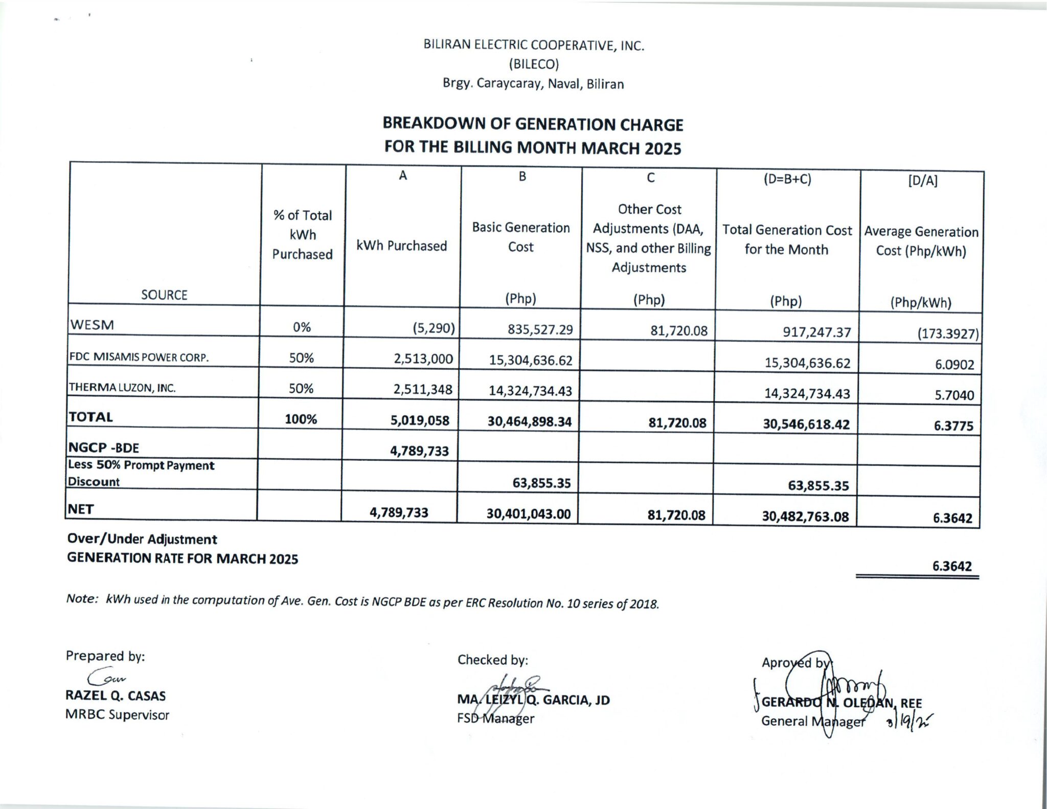 Breakdown of Generation Charge for March 2025