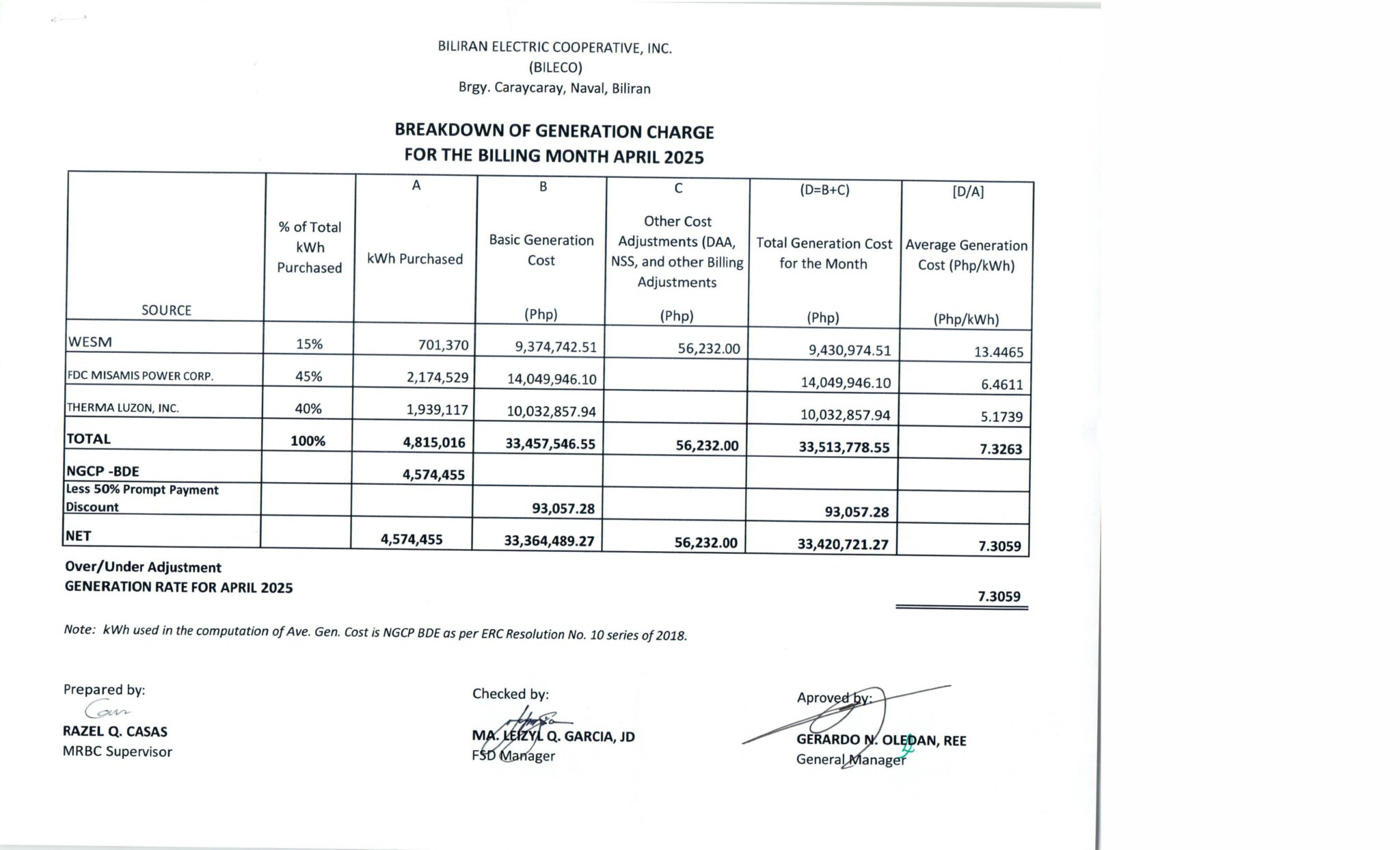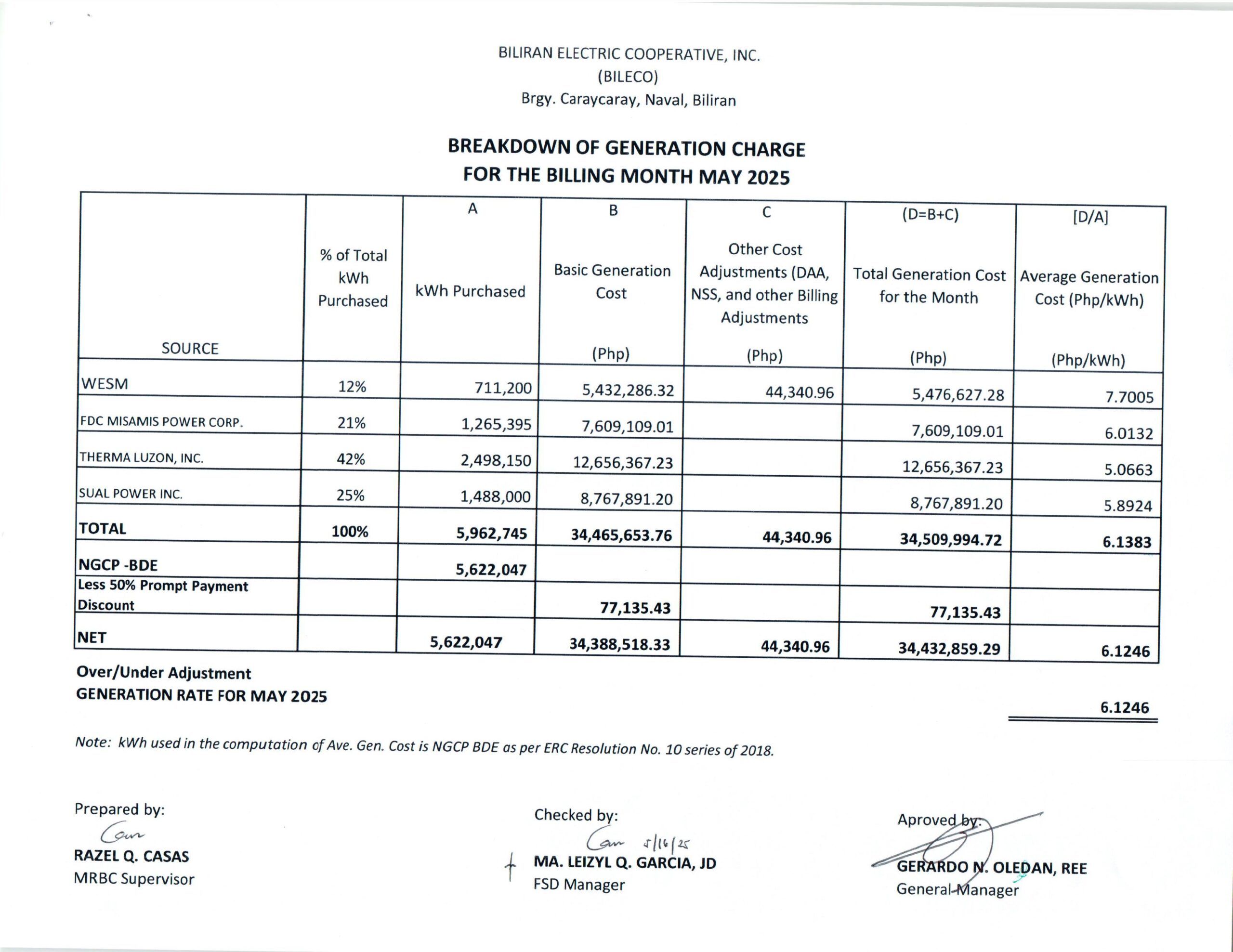 Breakdown of Generation Charge for April 2025