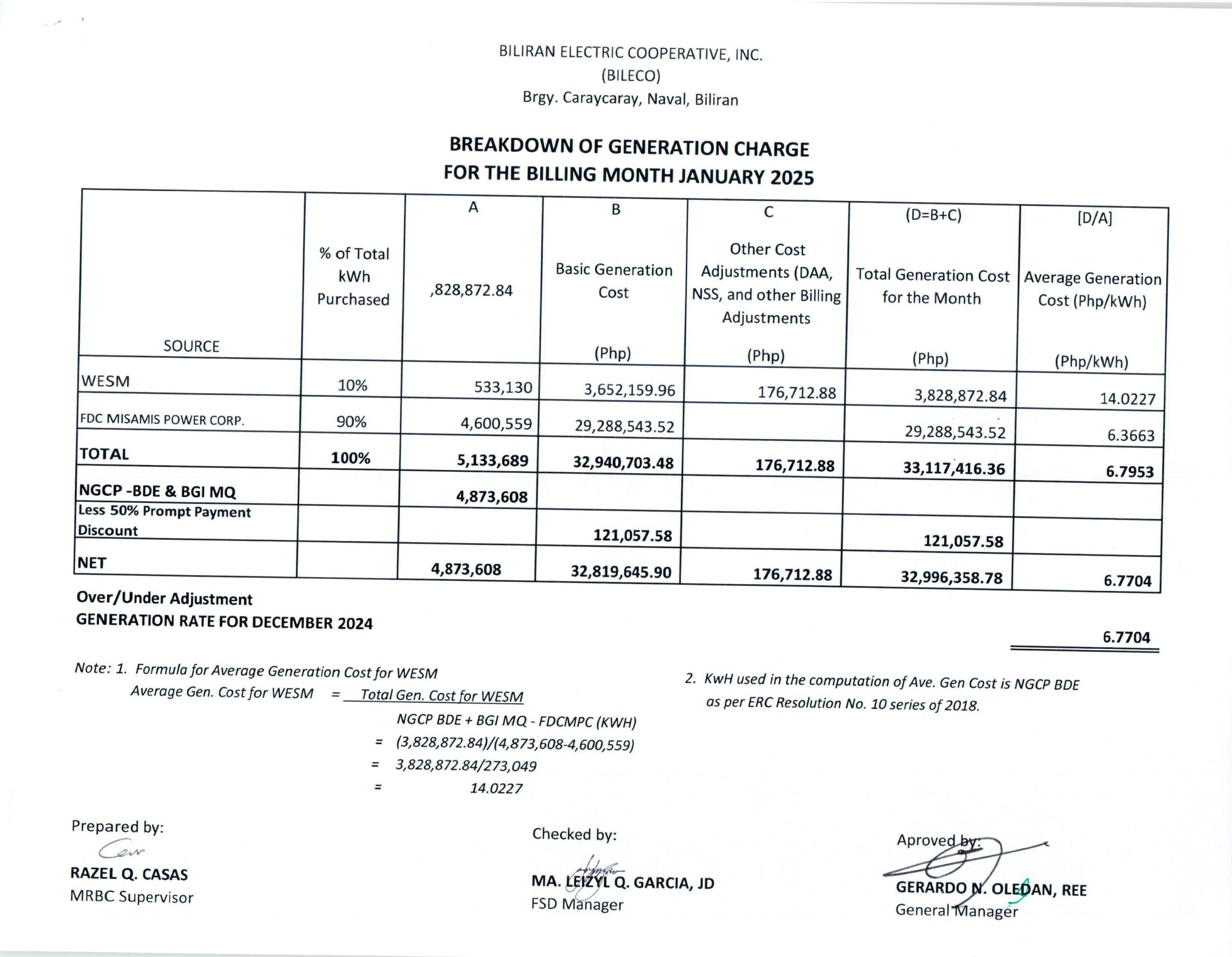 Breakdown of Generation Charge for January 2025
